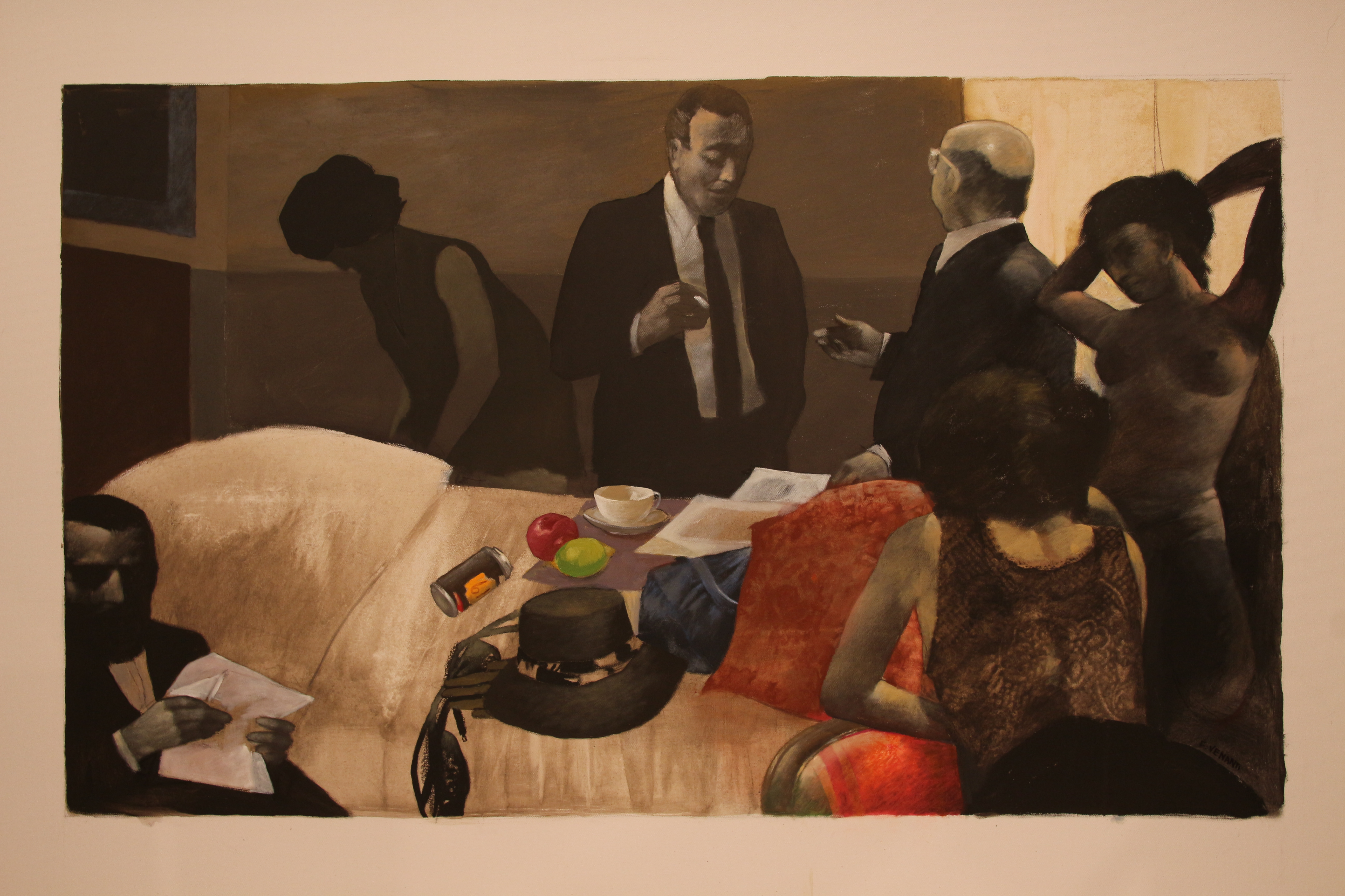 Conversazione intorno al letto, olio su tela, 150 x 100 cm - Venanti Franco